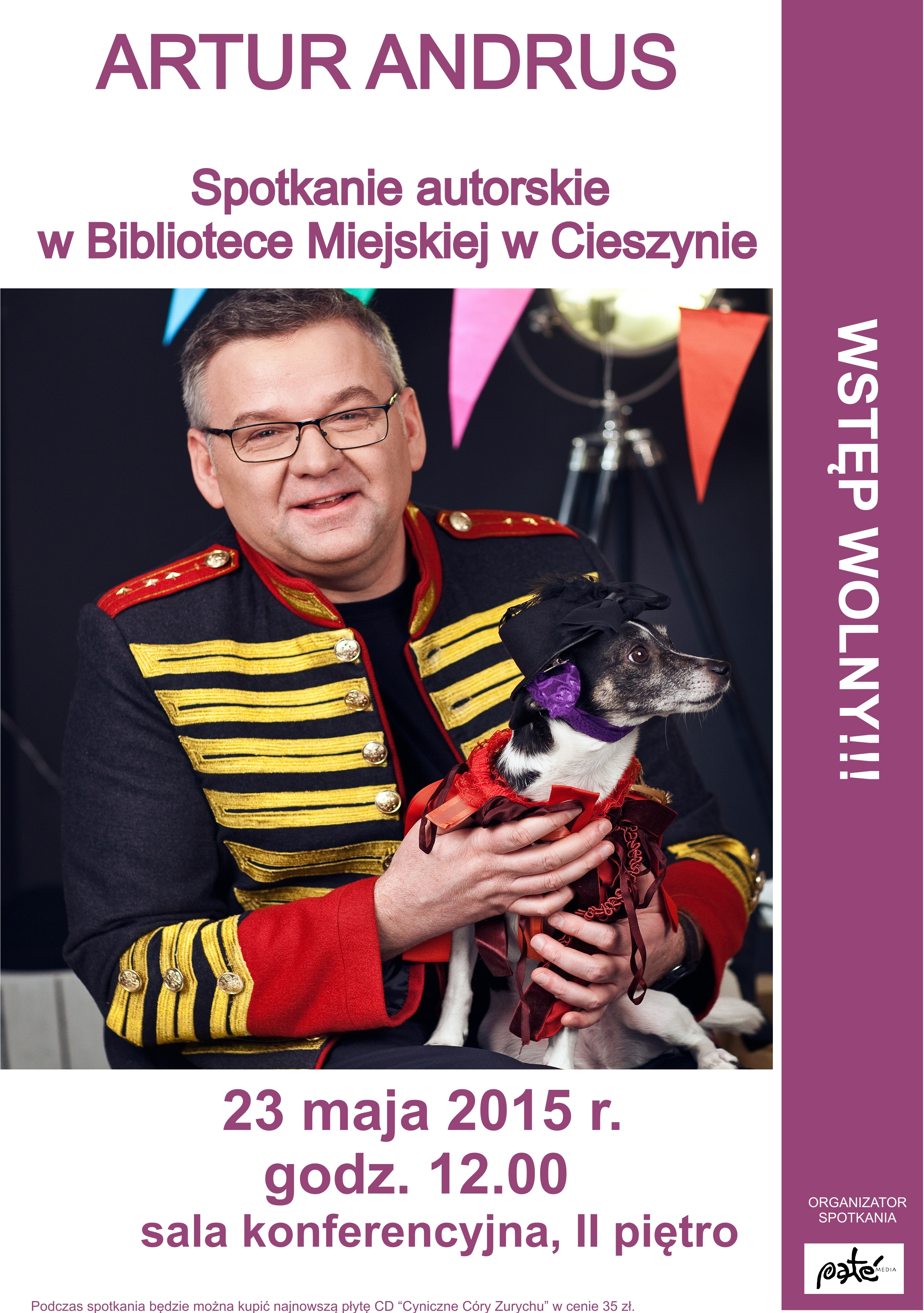 CIESZYN / Biblioteka Miejska w Cieszynie serdecznie zaprasza na spotkanie autorskie z Arturem Andrusem i promocję jego najnowszej płyty „Cyniczne Córy Zurychu”. Spotkanie odbędzie się 23 maja 2015 r. o godz. 12.00 w sali konferencyjnej na II piętrze biblioteki.