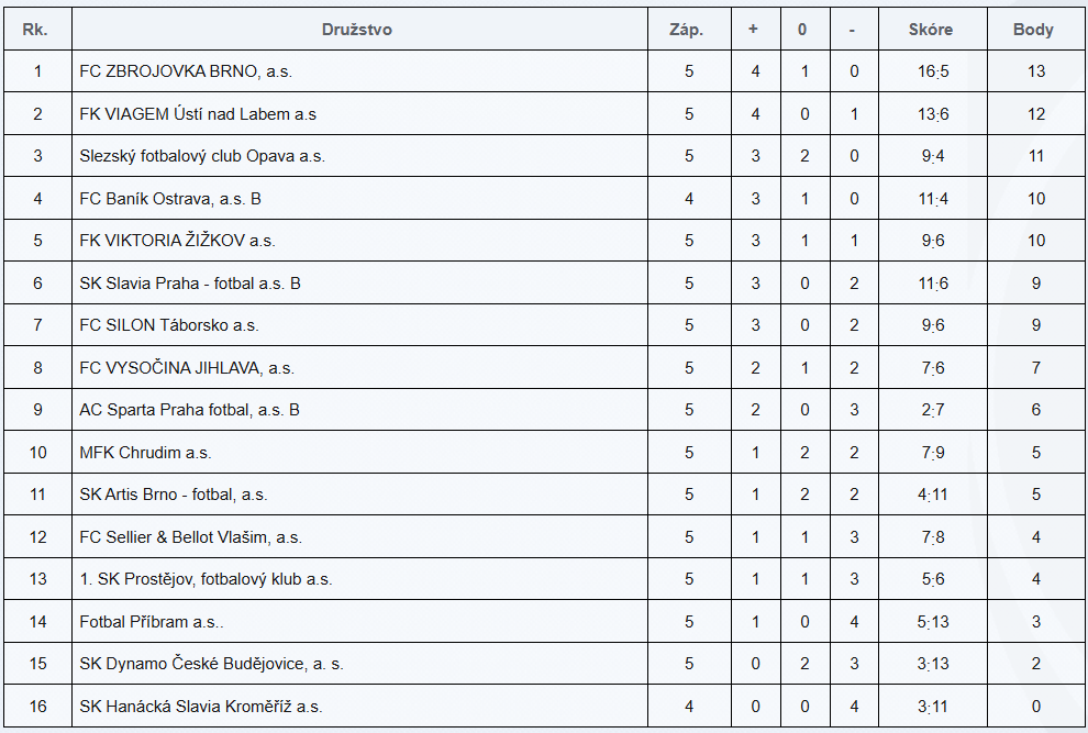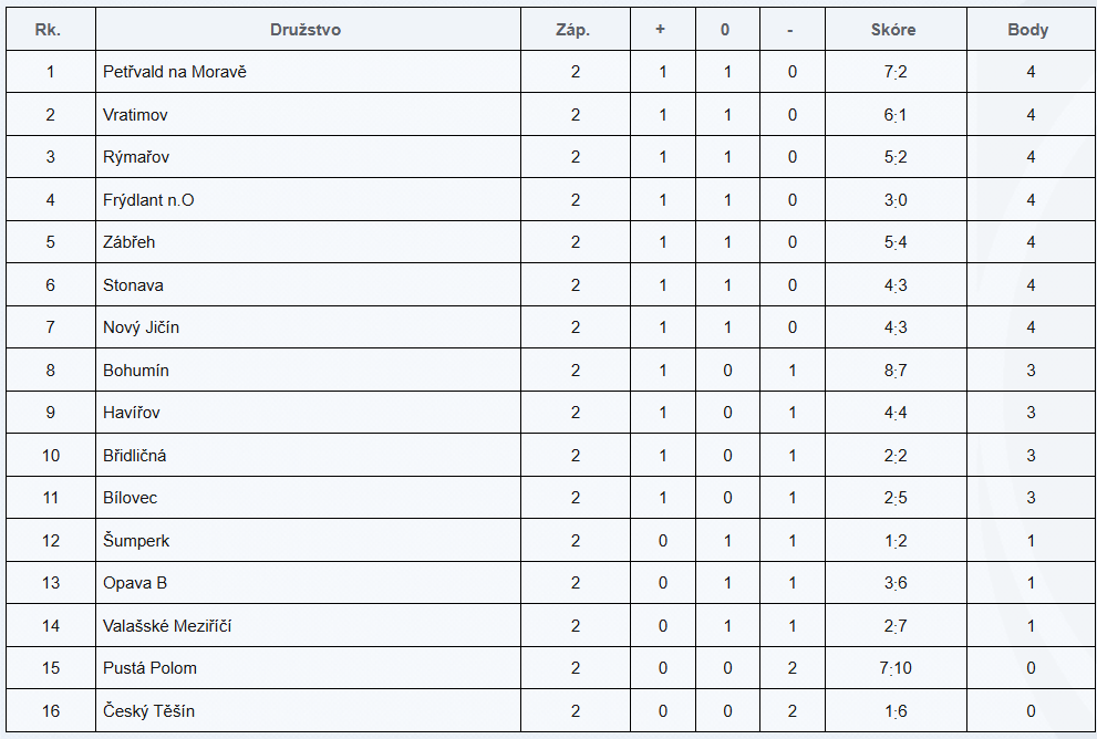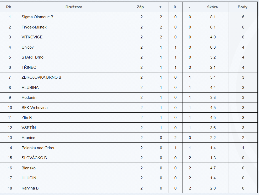 Remisem 2:2 zakończył się mecz między drużynami z Valašskégo Meziříčí i Stonawy – gole dla gości strzelali Petr Karel i Vojtěch Osvěčík. Z kolei aż sześć bramek zaaplikował rywalom Bospor Bogumin – ich autorami byli František Hanus, Samuel Fulier, Aleš Mooc, Tomasz Gomola i Ondřej Kubik (dwie). Efektowną wygraną przed własną publicznością popisał się także Hawierzów, który ograł 4:1 rezerwy Opawy. Gole dla gospodarzy strzelali Dominik Smekal, Leoš Gajdošík, Jakub Teplý i René Kálay.