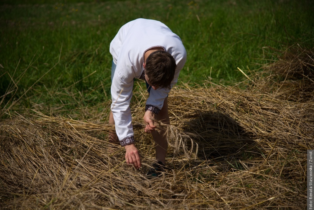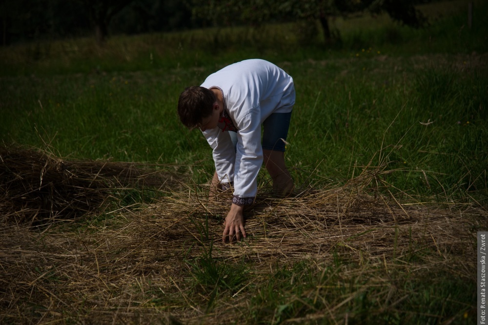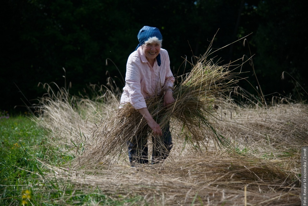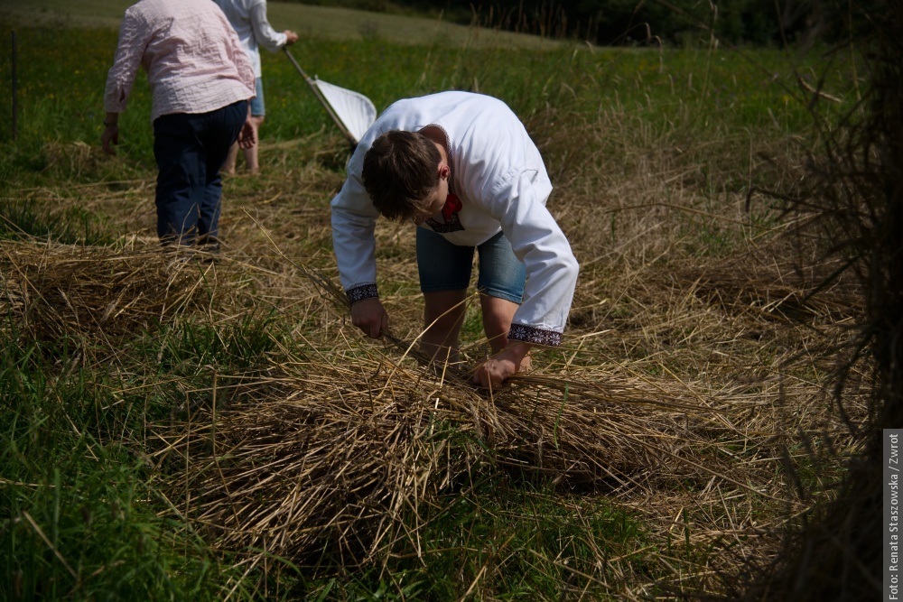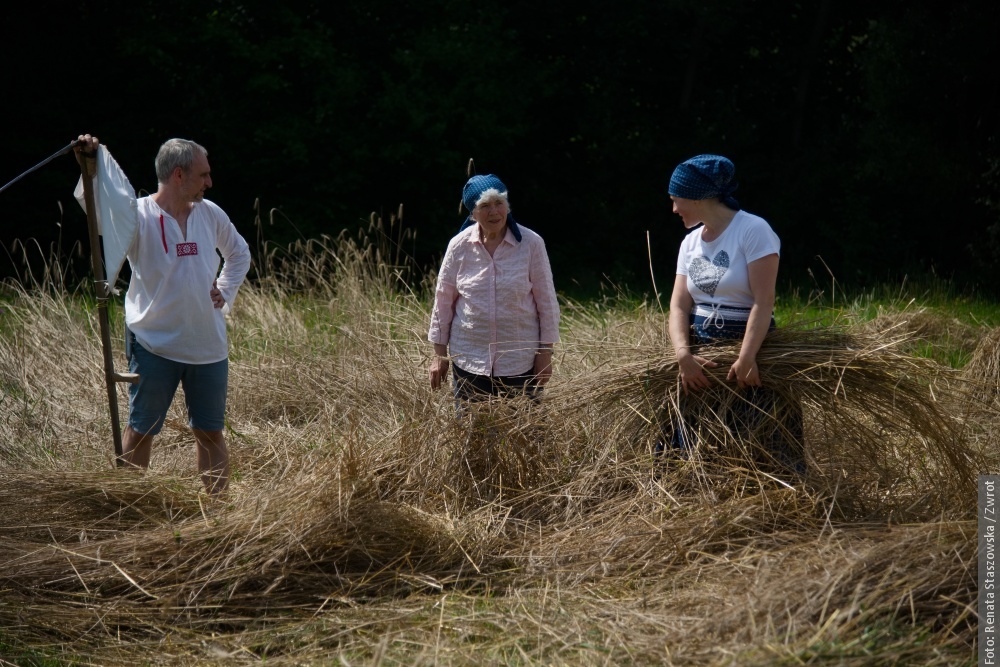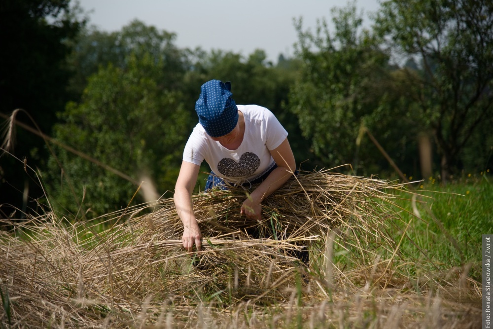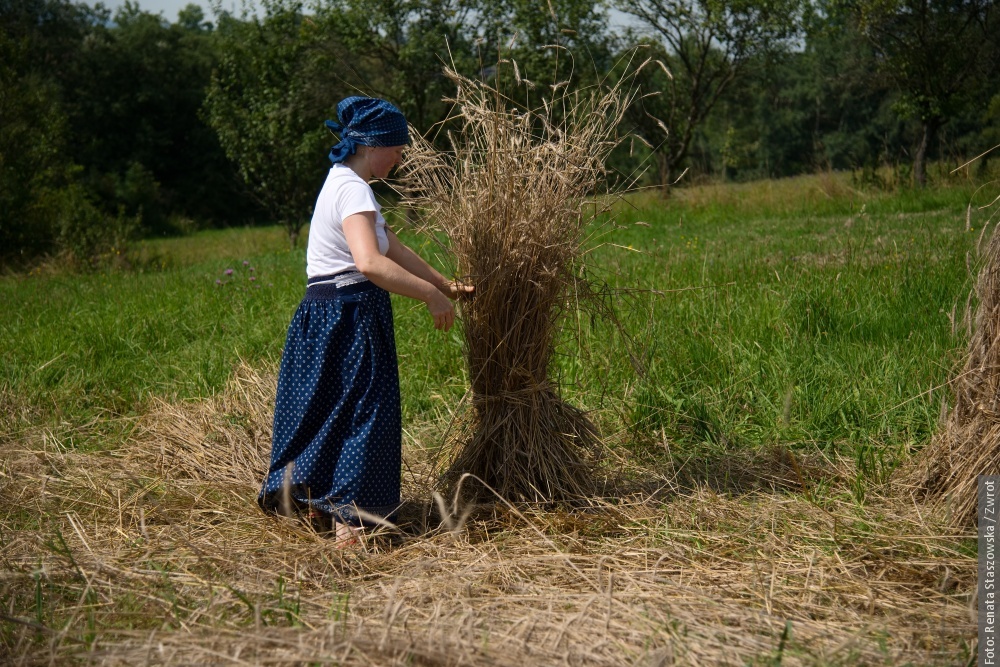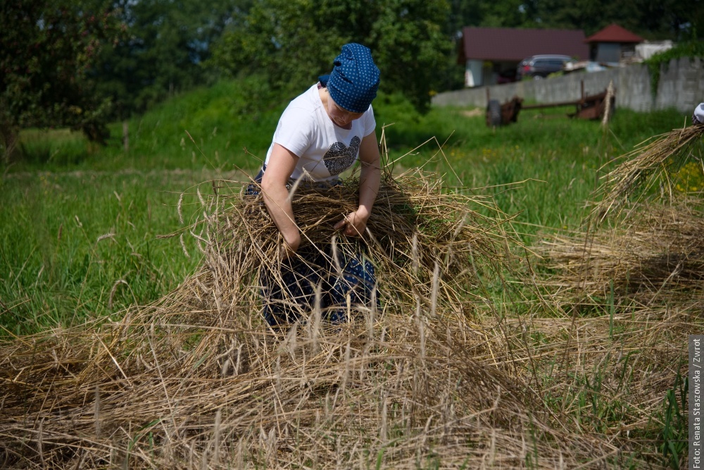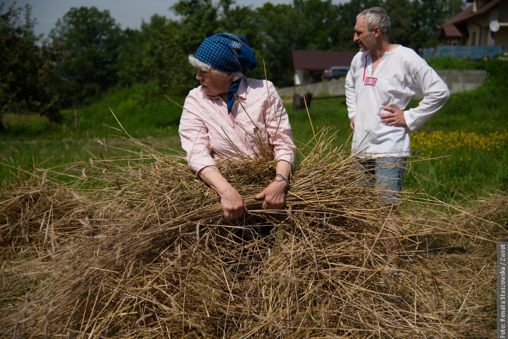 Gotowe snopki teraz schnóm na polu na słónku, potym ich bedzie trzeba – jak za downych czasów – wymłócić, jasne, że cepami. Z dłógi silnej słómy pani Krysia robi strużoki, kiere pieknie wóniajóm polym a zbożym. Musi sie na nich fajnie, ale głównie zdrowo spać. Dziynki rodzinie Muchów downe rzemioło fórt żyje i narazie nie zaginie.
