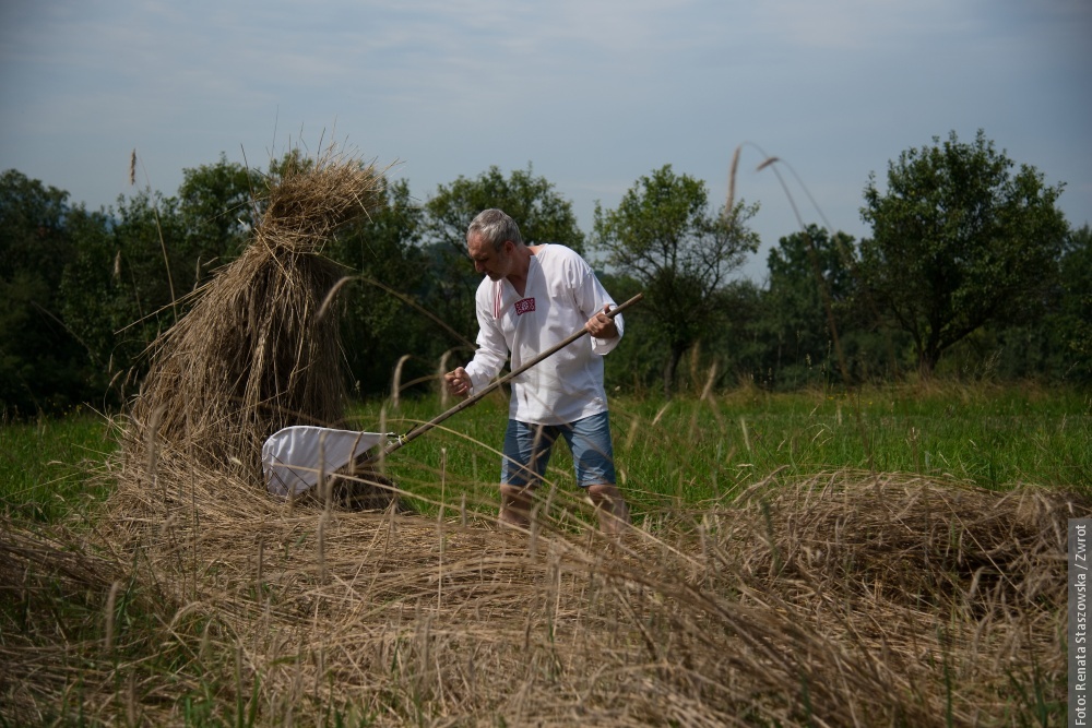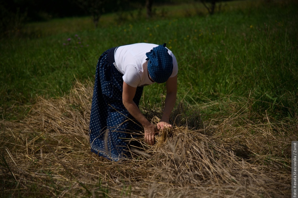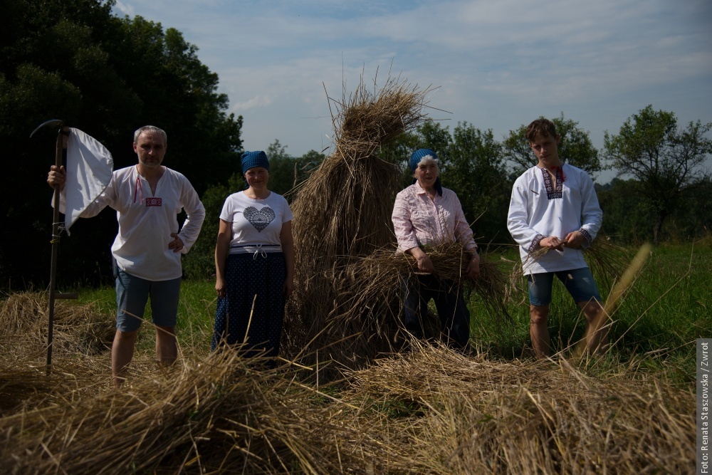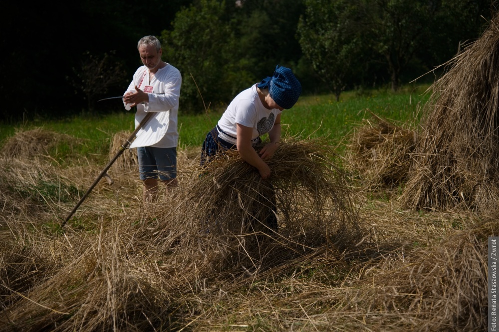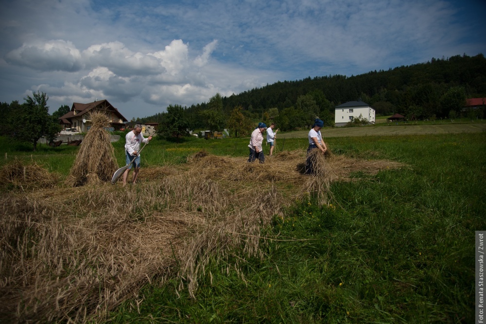 MOSTY KOŁO JABŁONKOWA / U Muchów w Mostach koło Jabłónkowa w sobote popołedniu były żniwa – taki, jaki sie kiejsi downo robiło. Na tym małym poletku urosła krzica – stare karpackie zboże – a wszycko to kosili ryncznie. Zamiast maszyn była kosa, były snopki i robota dlo całej rodziny. W lufcie było czuć skoszóne zboże, kiere wóniało jak za starych dobrych czasów.