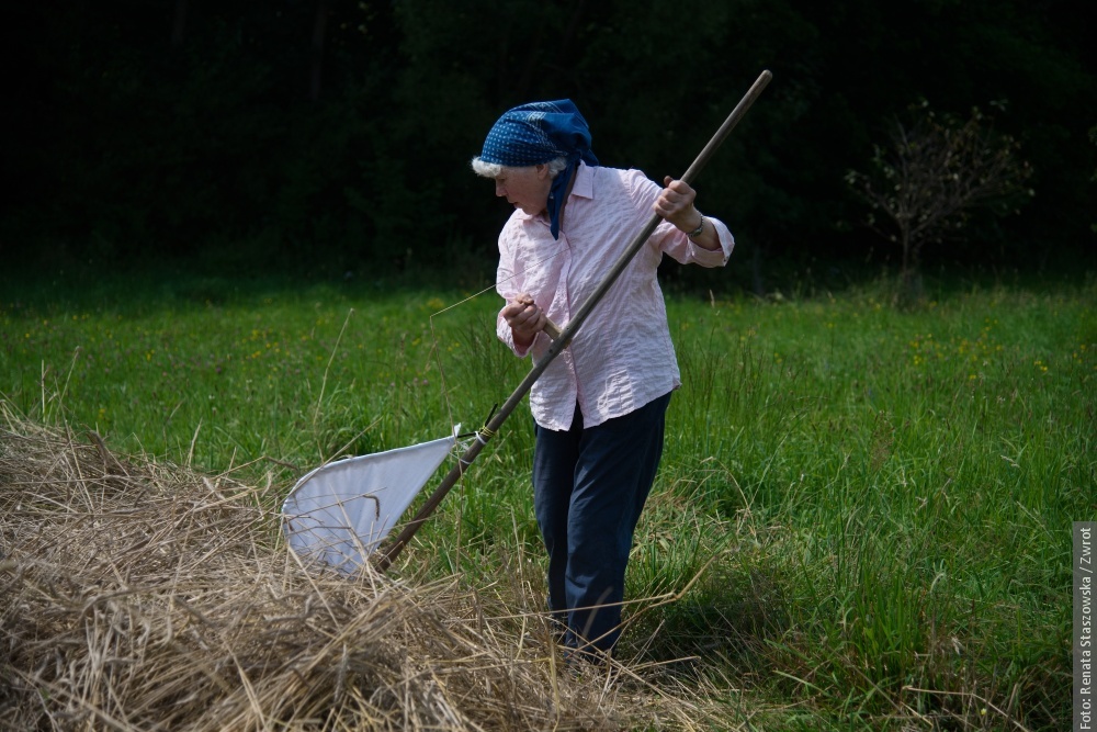 Przed tym trzeba było kose łosełkóm nałostrzić. Jego żóna Krysia – kiero se to wszystko wymyślała – pokoszóne zbożi odbiyrała i wiónzała w snopki. Na polu to musi uschnyć. Muszóm to kosić ryncznie, aby sie słóma nie połómała i szło z ni zrobić strużoki. Pumogali syn a starka, kiero aji w starszym wieku sie na polu zwyrtała jako młódka, widać było, że dóma nie leżi, ale góni kole gazdówki. Kómbajn by tam nimóg wjechać, bo by słóme połómoł i nie szło by z ni zrobić strużoki.