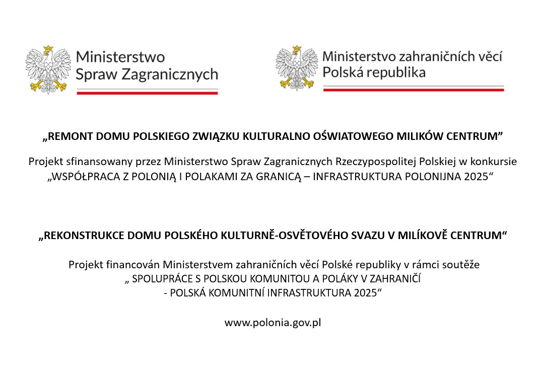 Projekt pod nazwą „Remont Domu Polskiego Związku Kulturalno-Oświatowego w Milikowie-Centrum” jest sfinansowany z budżetu państwa polskiego przez Ministerstwo Spraw Zagranicznych RP w konkursie „Infrastruktura Polonijna 2025” za pośrednictwem Fundacji „Pomoc Polakom na Wschodzie” im. Jana Olszewskiego.
