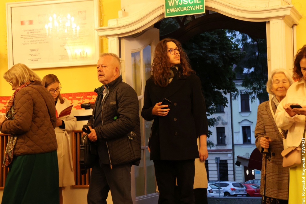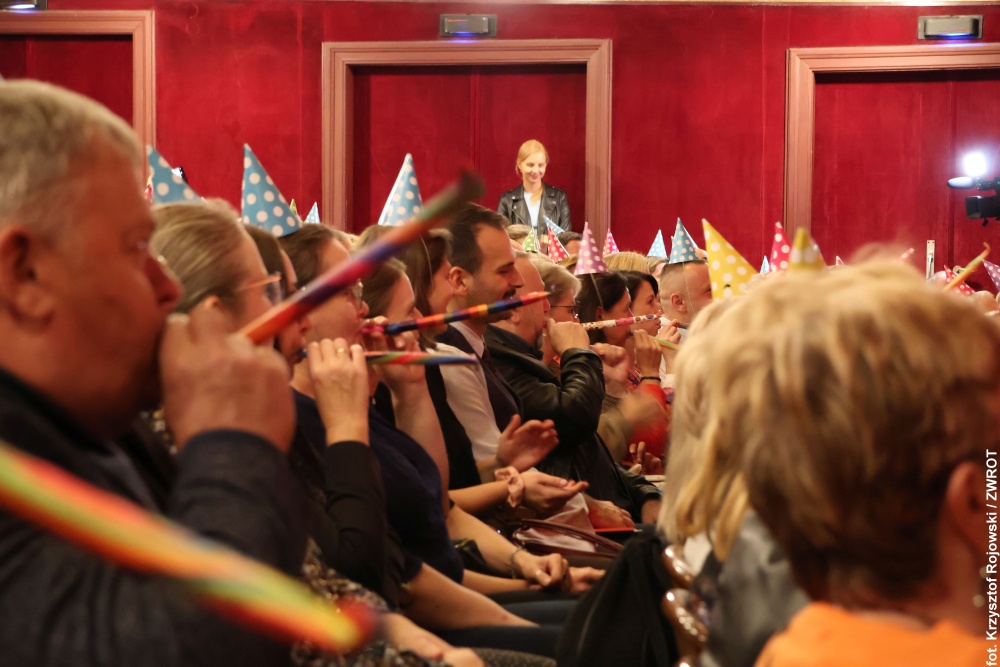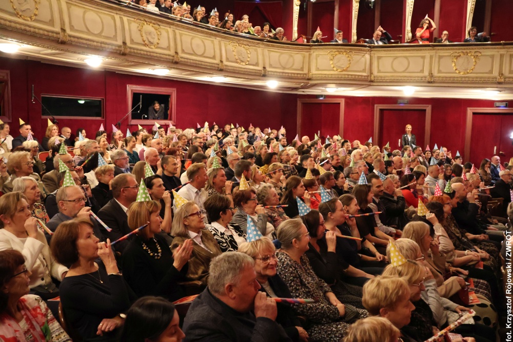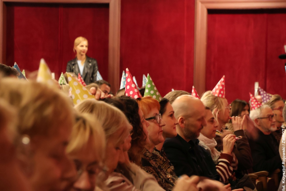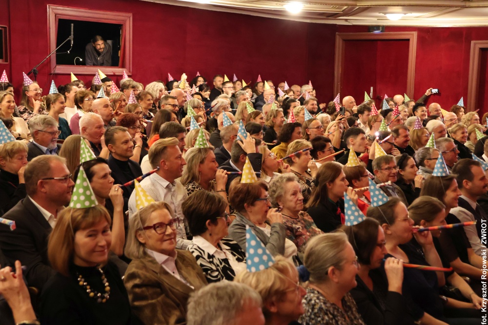 Dyrektor festiwalu poprosił także licznie zgromadzoną publiczność o założenie urodzinowych czapeczek i dwukrotne dmuchnięcie w trąbki – za jubileusz 115-lecia budynku oraz 80-lecia powstania pierwszego polskiego zawodowego teatru na Śląsku Cieszyńskim.