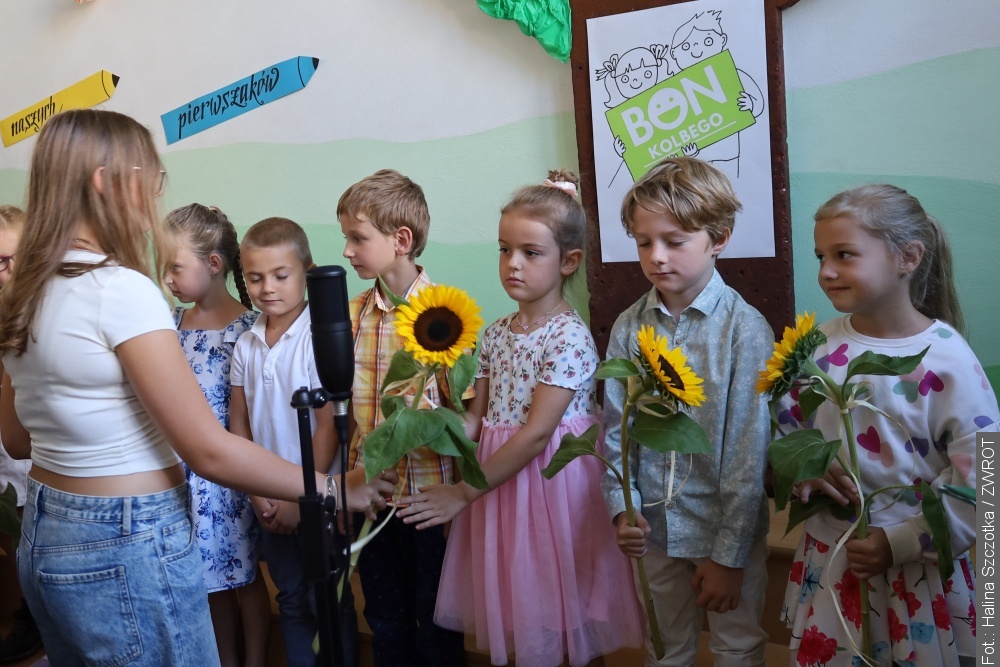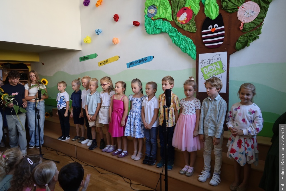 Pierwsze kroki w szkole umilili pierwszoklasistom chórzyści z chóru Mała Jabłoneczka pod batutą Moniki Łysek. Następnie uczniowie klasy dziewiątej przywitali nowych kolegów kwiatami.
