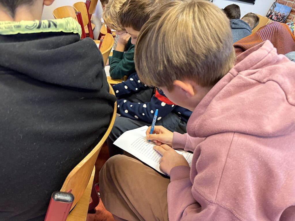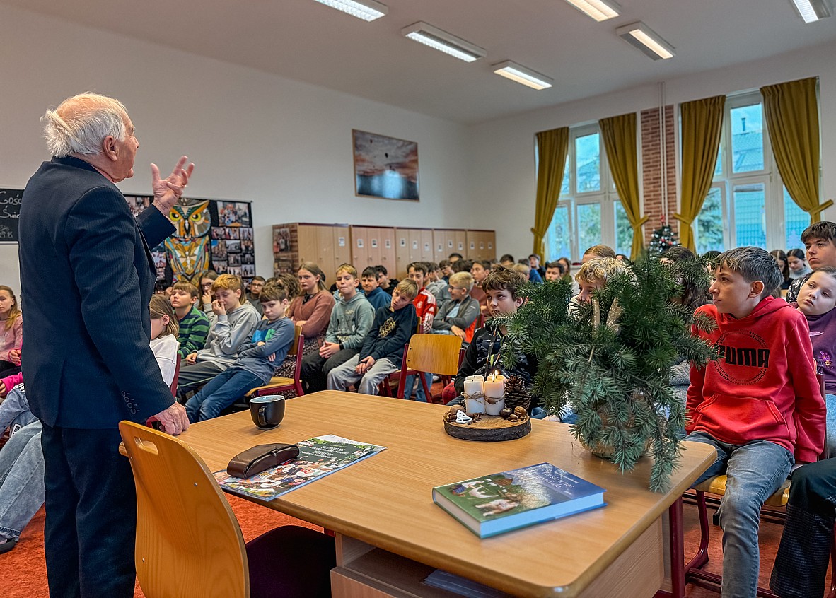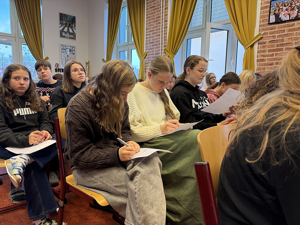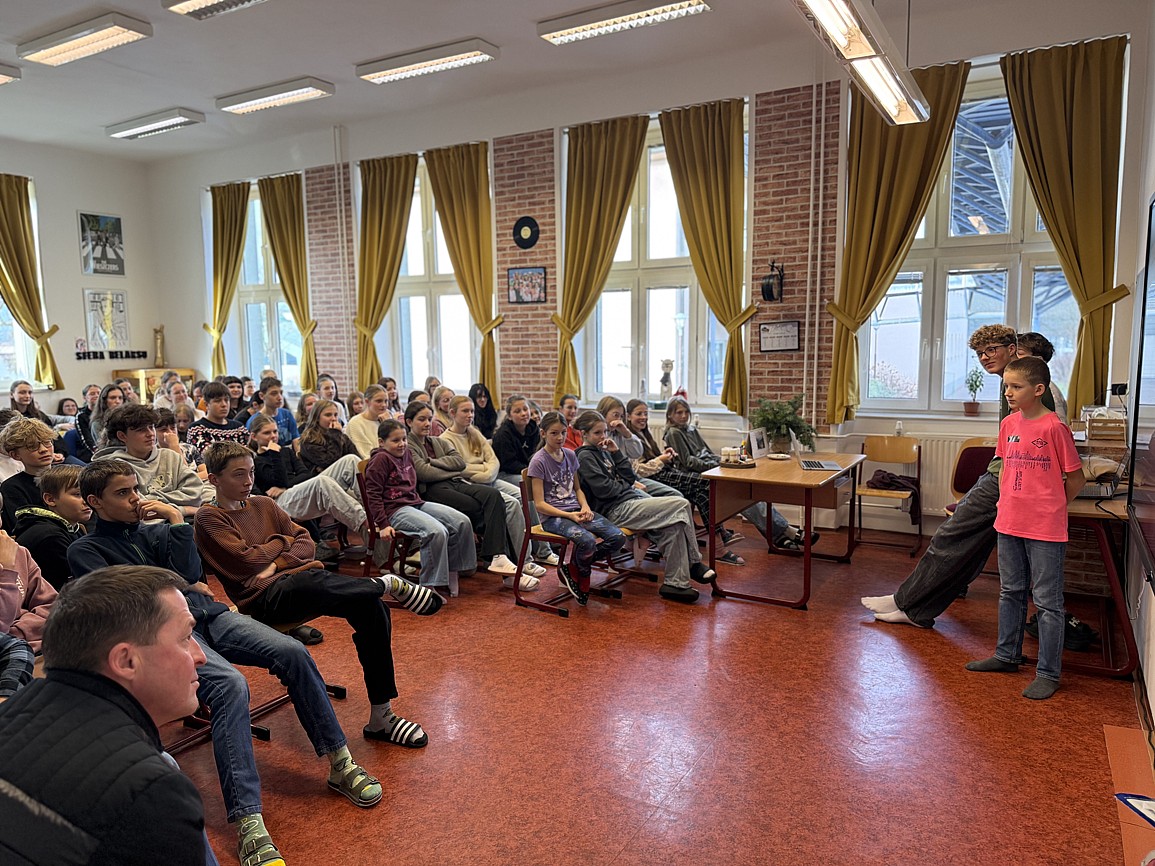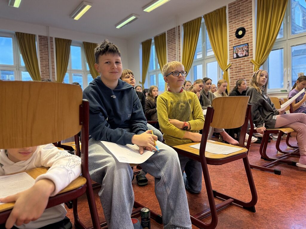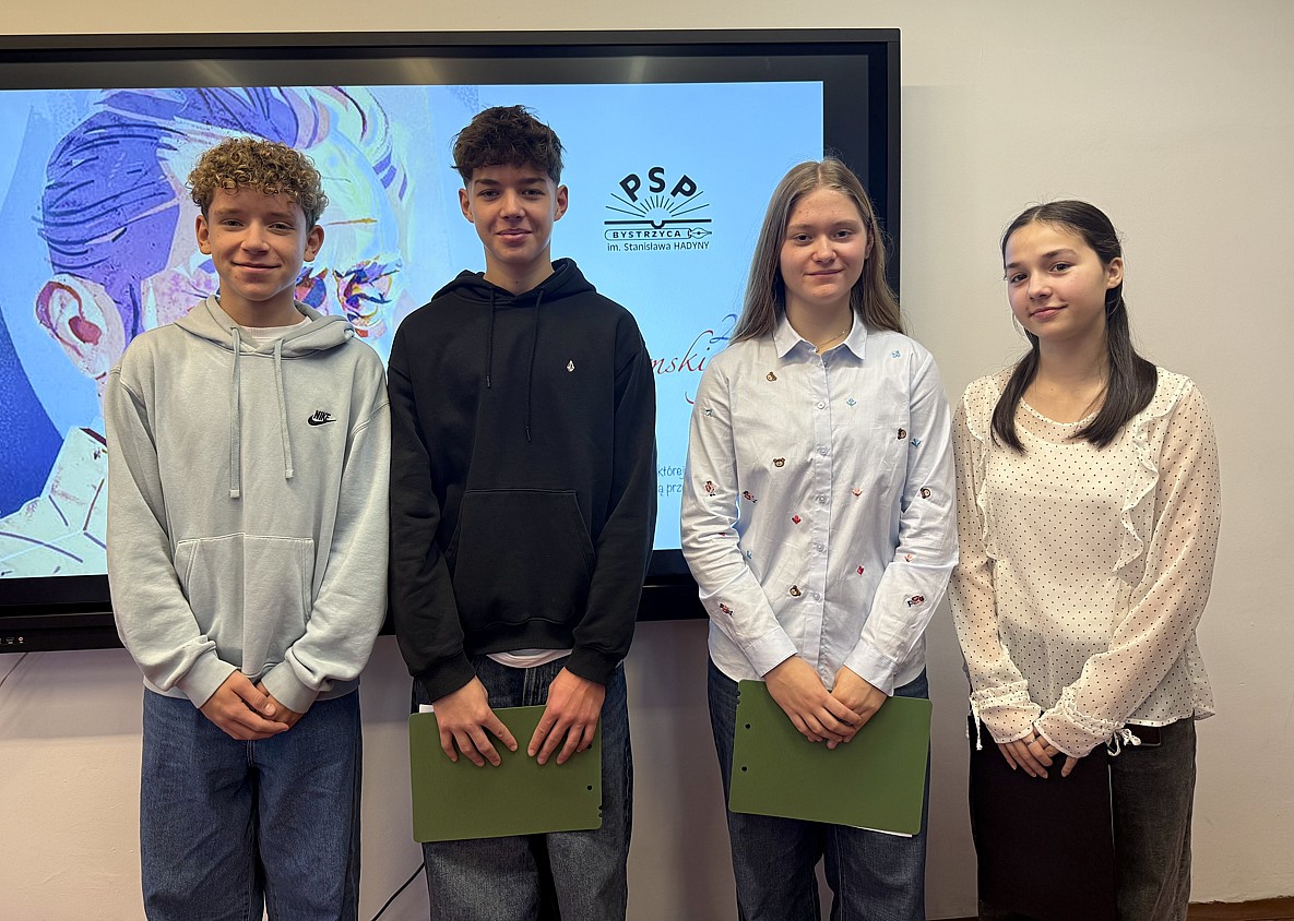 Zwrócili uwagę na aktualność poruszanych przez autora tematów – odpowiedzialności, wrażliwości społecznej i moralnych wyborów – pokazując, że literatura sprzed lat wciąż potrafi stawiać pytania ważne także dziś. Prezentacja była dowodem na to, że szkolna literatura może stać się przestrzenią refleksji, dyskusji i samodzielnego myślenia, a nie jedynie obowiązkiem wynikającym z programu nauczania.