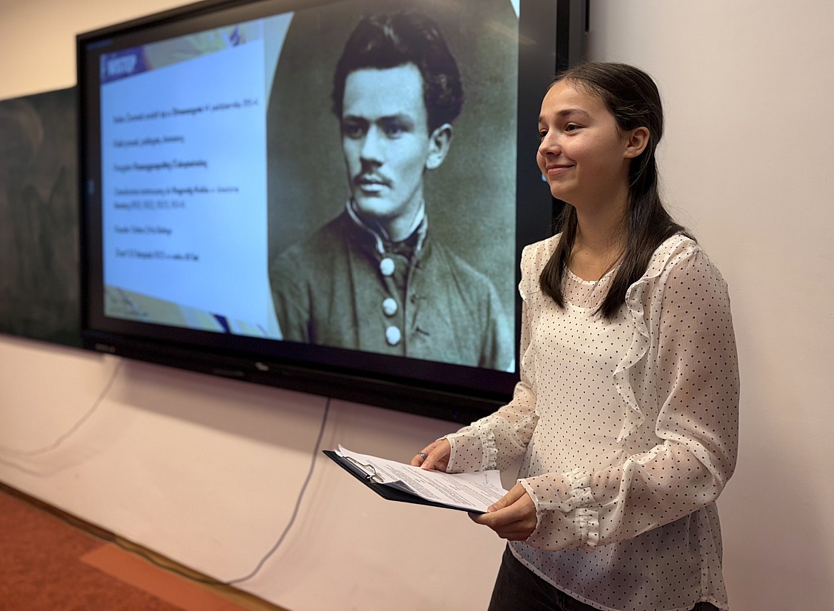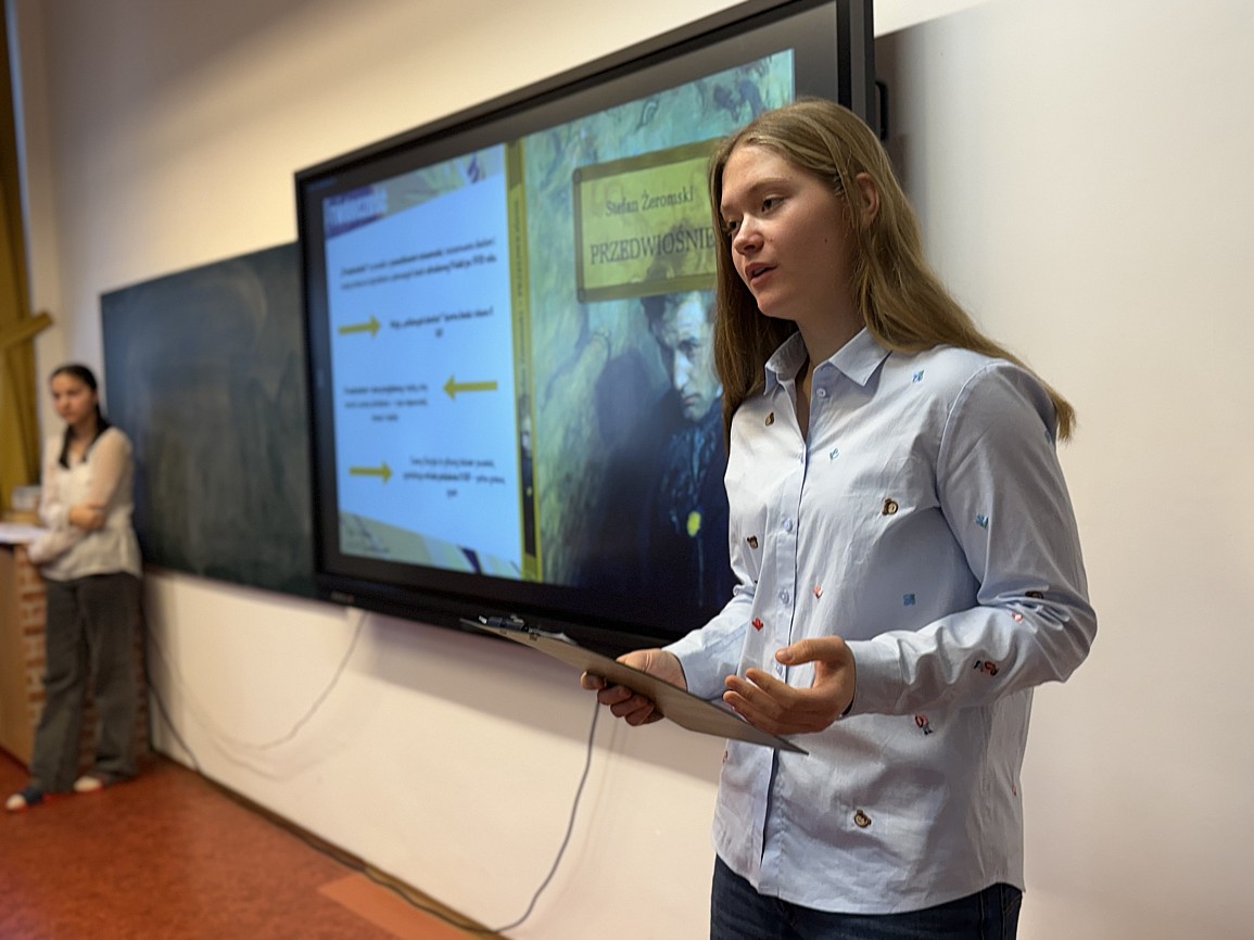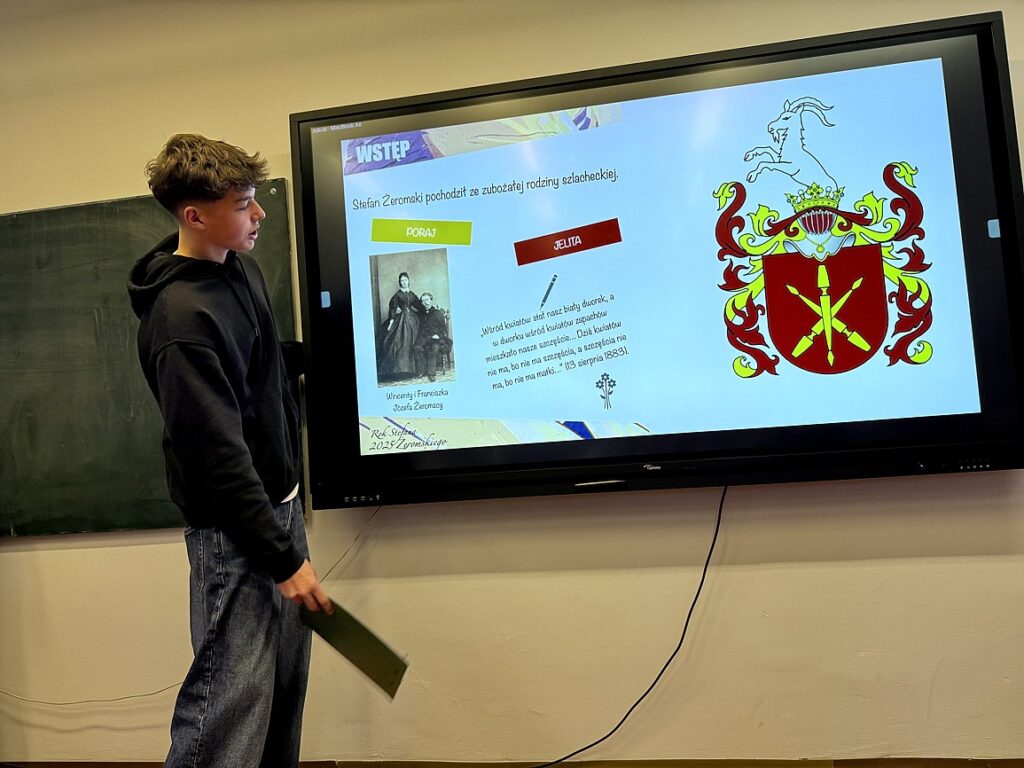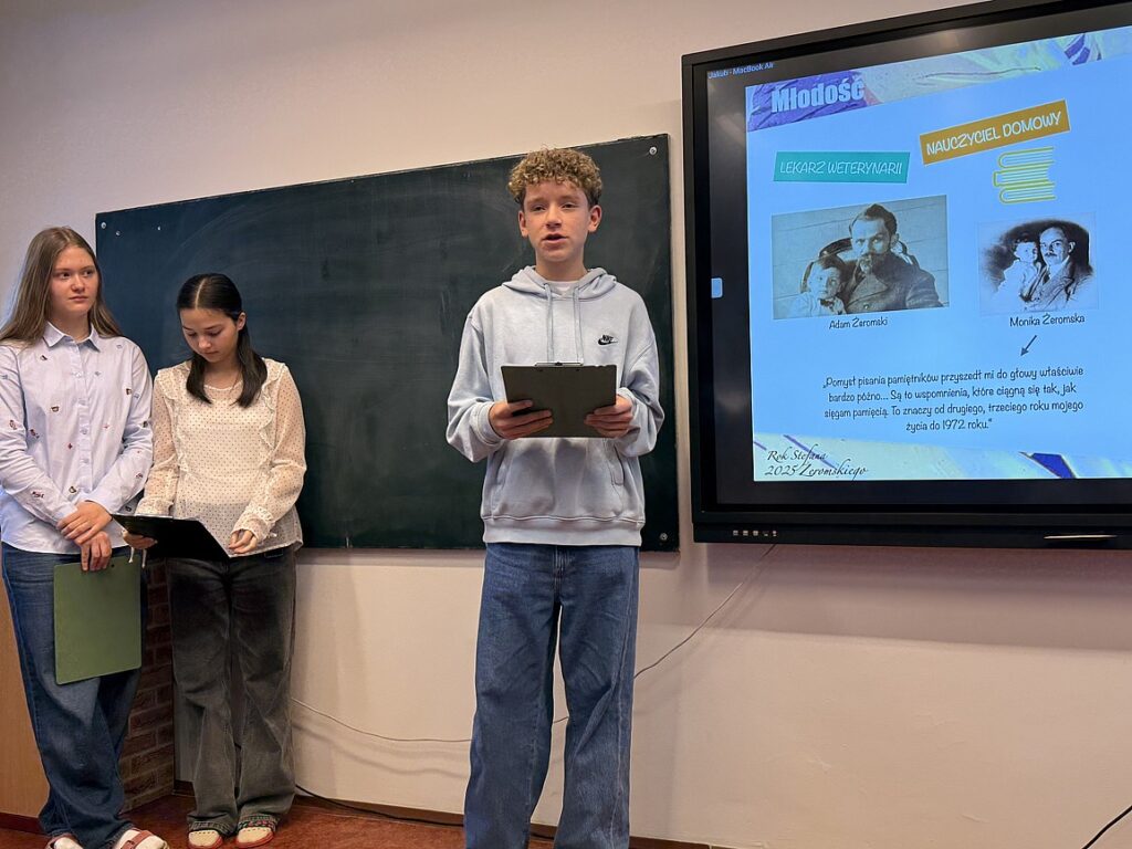 Nie zabrakło również literatury. Uczniowie klasy IX przygotowali wykład z okazji Roku Stefana Żeromskiego, który stał się nie tylko hołdem dla jednego z najwybitniejszych twórców polskiej literatury, ale także świadectwem dojrzałego i świadomego podejścia młodzieży do pracy z tekstem. W swoim wystąpieniu przypomnieli najważniejsze fakty z życia pisarza, kontekst historyczny jego twórczości oraz znaczenie dzieł Żeromskiego dla kolejnych pokoleń czytelników.
