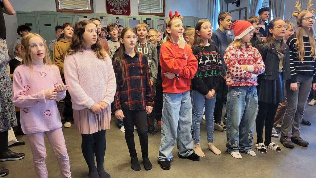 Na zakończenie projektowego miesiąca cała szkoła spotkała się, by wspólnie poczuć prawdziwie świąteczną atmosferę. Było kolędowanie, łamanie się opłatkiem i składanie życzeń.