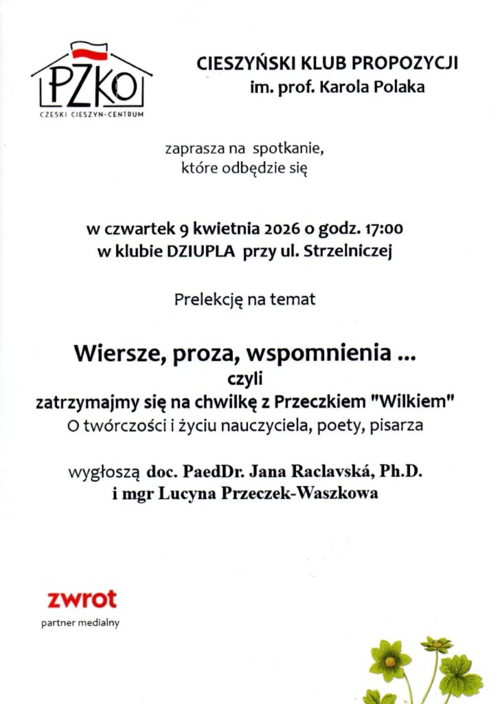 CZESKI CIESZYN / Już jutro, 9 kwietnia, Cieszyński Klub Propozycji im. prof. Karola Polaka zaprasza na spotkanie poświęcone twórczości Wilhelma Przeczka. Wydarzenie rozpocznie się o godz. 17.00 w klubie Dziupla przy ul. Strzelniczej.